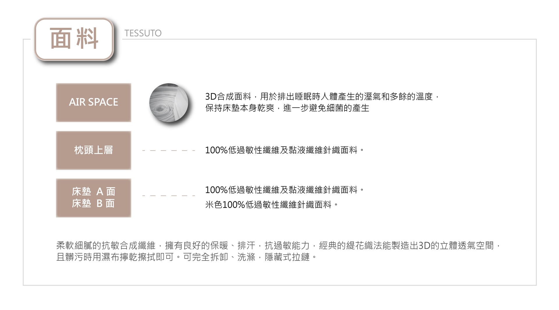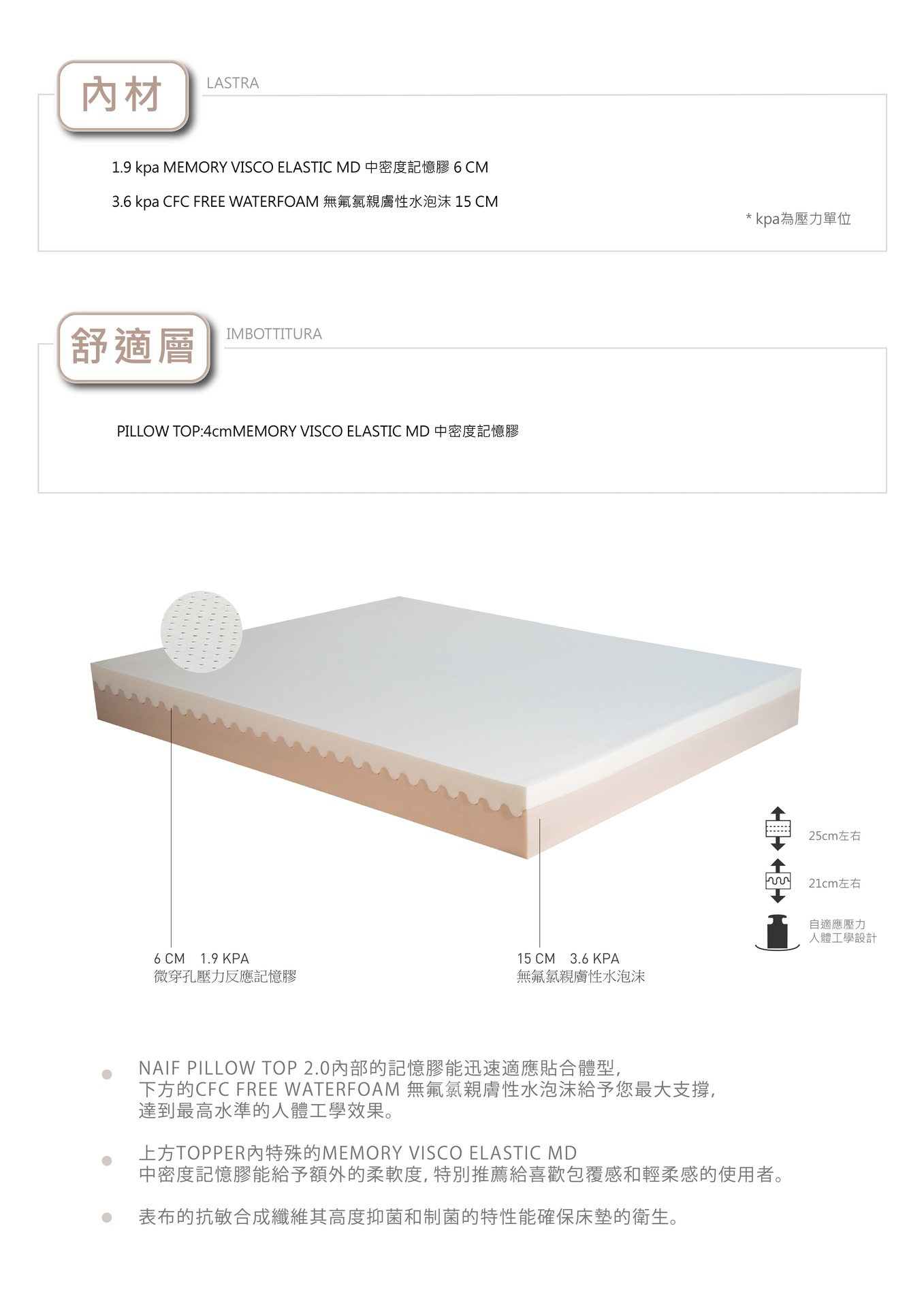 使用4公分的記憶膠,具絕佳的自塑型能力,可加強床墊舒適感及放鬆感。