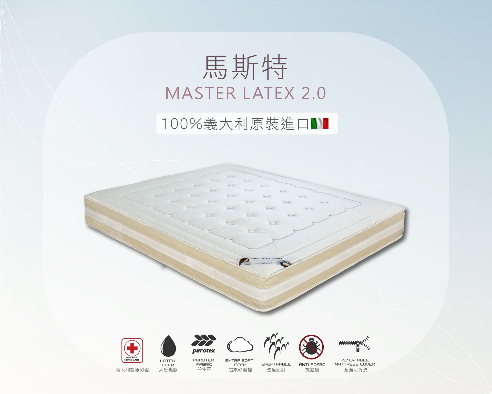 乳膠系列馬斯特 MASTER LATEX 2.0 舒適度偏軟偏硬 義大利醫療認證表布PUROTEX - ACTIVE PROBIOTICS ® 活性益生菌AIR SPACE 3D立體透氣網層 填充物EXTRA SOFT FOAM 超柔軟水泡沫內芯100% LATEX FOAM 百分之百天然乳膠尺寸單人(歐規)105 ×188雙人(5尺)150 × 188 雙人(6尺)180 × 188雙人(6 × 7尺)180 × 210適用族群有過敏體質、曾罹患骨科疾病、體型胖瘦皆宜乳膠系列系列百特斯(變形金剛) BILATEX MEMORY 2.0馬斯特 MASTER LATEX 2.0普莉緹 PRETTY LATEX 2.0極光 AURORA LATEX 2.0